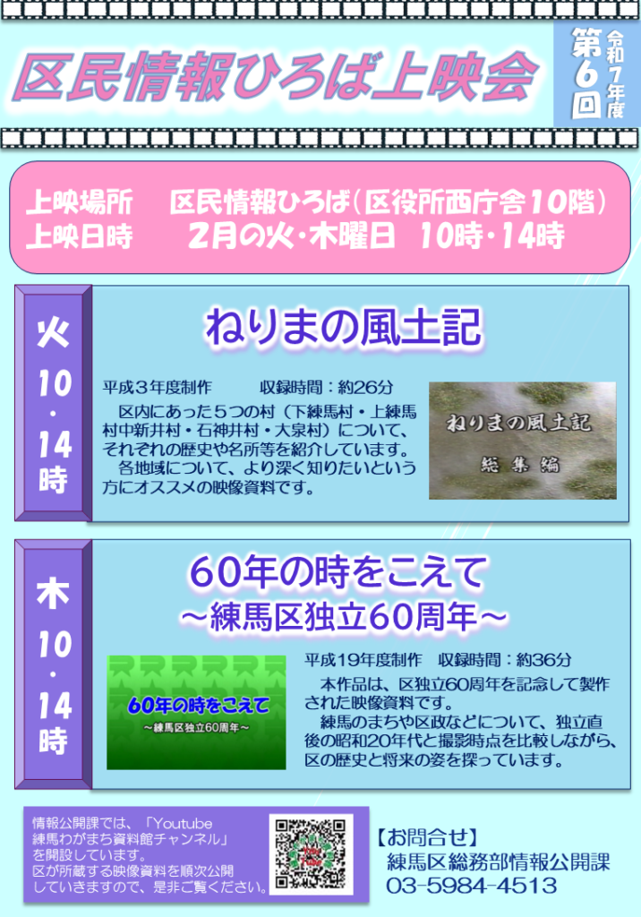 区民情報ひろばでは、区が制作した映像作品を上映しており、2月は火曜、木曜に実施します。